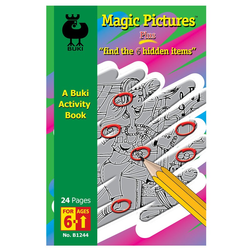 Magic Pictures & Find the 6 Hidden Items. Ages 6 & Up. Medium Buki Books are 5” x 8” and contain at least 12 to 24 different activities per book. PK 12 min.